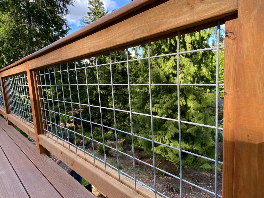 Outdoor select wood handrail with galvanized hog wire panels. The top rail is composite decking. Decking Fiberon® Good Life - Cabin.