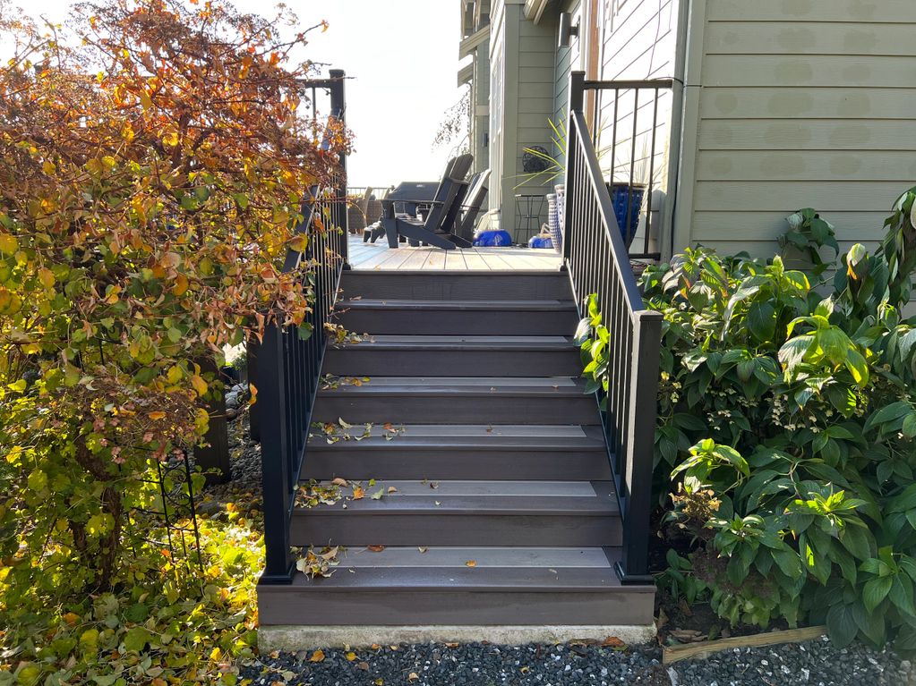 RailFX® black aluminum picket handrail. Fiberon® Promenade PVC deck boards. Exterior boards - Weathered Cliff. Interior boards- Shaded Cay.
