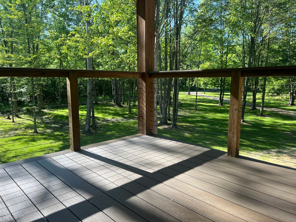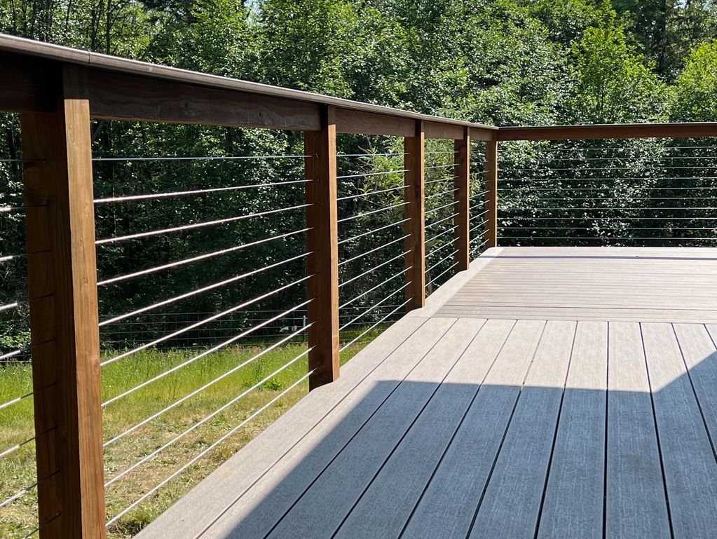 TimberTech® Prime + Dark Cocoa composite decking and a stainless-steel cable handrail. The handrail is constructed with pressure treated lumber and the top rail is a composite deck board.