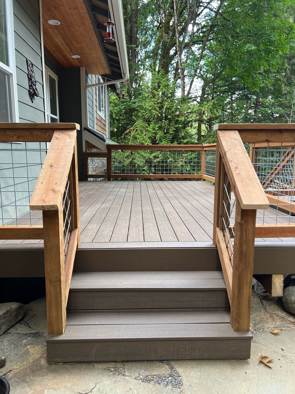TimberTech® composite decking. Pressure treated lumber and galvanized hog wire for the handrail.